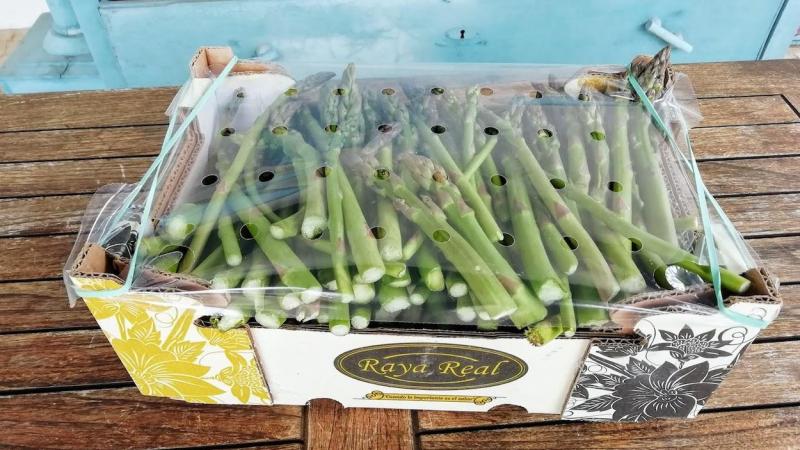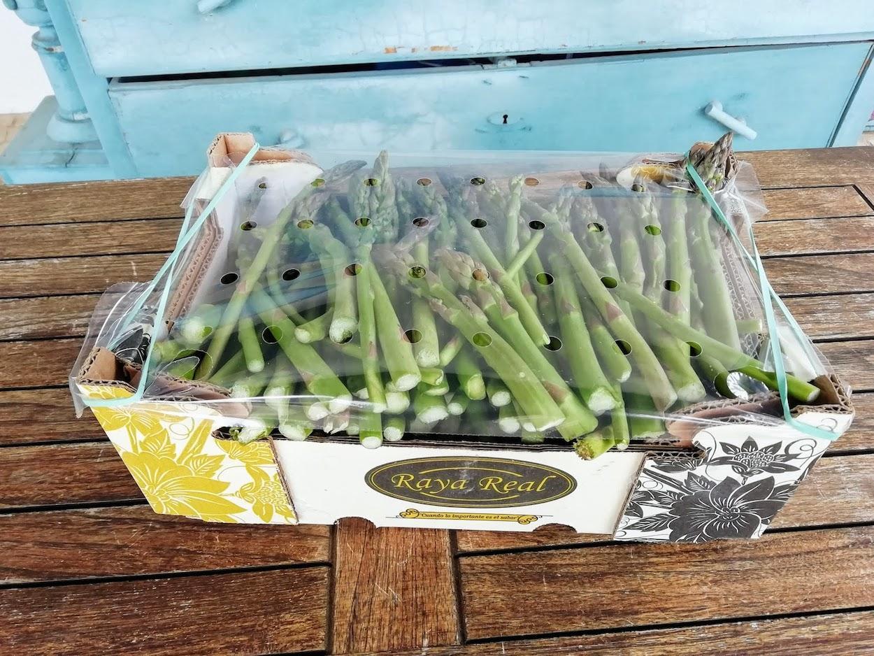 Esta mañana me ha sorprendido la llegada a la hora convenida del pedido de verdura fresca que hice el pasado jueves: la foto recoge solo una caja de puntas de espárragos cultivados en Los Palacios (Sevilla) que son exquisitos, a mi me gustan hasta crudos sin sal ni nada.