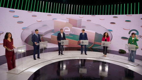 El segundo bloque, el de Economía, Empleo y Fiscalidad, lo abrió Macarena Olona. «Ustedes dicen lo mismo que Ana Patricia Botín», dijo. Teresa Rodríguez la escuchaba con los brazos cruzados. Nieto apeló a Yolanda Díaz para defender su ideario. Rodríguez pidió la palabra para llamar «negacionista climática» a Olona. Espadas, Moreno y Marín miraban al horizonte. «Iberdrolona», llamó Rodríguez a Olona por sus acciones en la compañía energética. Olona se defendió atacando a Kichi, su marido y alcalde de Cádiz, acusándolo de gastar dinero público en comilonas. Olona tiró de temario. Indultos a secuestradoras, el jamón de Garzón y una versión de las huelgas del metal de Cádiz sui generis. Juan Marín quiso reconducir el debate. Habló de creación de empresas y de crecimiento económico en tiempos de pandemia. «Usted no conoce esto», le dijo Marín a Macarena. «¿Ve usted el peligro de lo que tiene al lado?», le dijo Espadas a Moreno, señalando a la candidata de Vox. «Por eso voy a sacar una mayoría suficiente», le contestó.