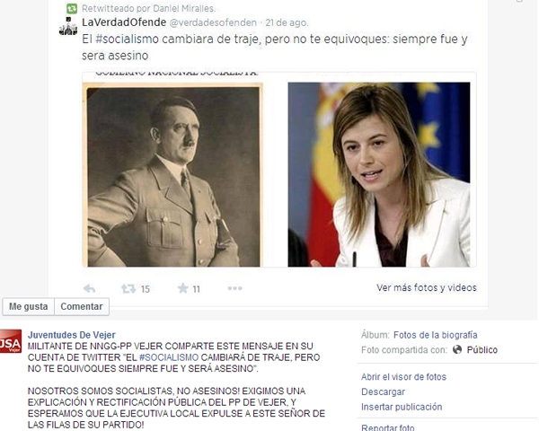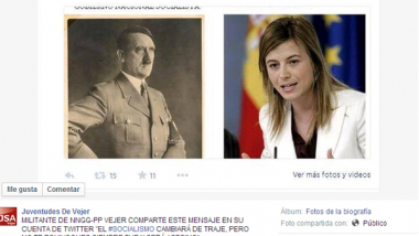 Polémica de alta intensidad la que se ha creado en la localidad gaditana de Vejer a cuenta de un tuit compartido por los jóvenes del PP del municipio. En la red social Twitter apareció un mensaje compartido por las Nuevas Generaciones del PP en Véjer en el que se ve en una fotografía a la exministra socialista Bibiana Aído junto a Adolfo Hitler y el siguiente texto: "El #Socialismo cambiará de traje, pero no te equivoques: siempre fue y será asesino".