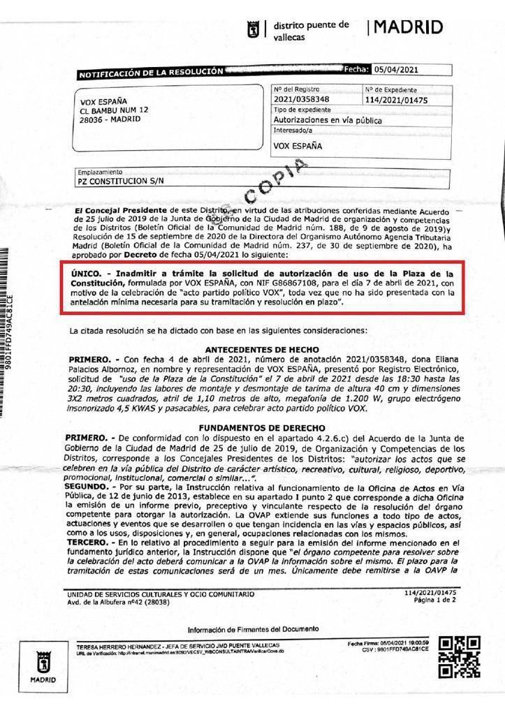 El Ayuntamiento de Madrid ha negado a Vox el uso de la plaza de la Constitución del distrito de Vallecas para el inicio de campaña de cara a las elecciones en la Comunidad de Madrid el próximo 4 de mayo. La Junta municipal del distrito ha argumentado en un escrito que la formación de Santiago Abascal no ha comunicado la petición de uso del suelo público con la antelación debida, de un mes.
