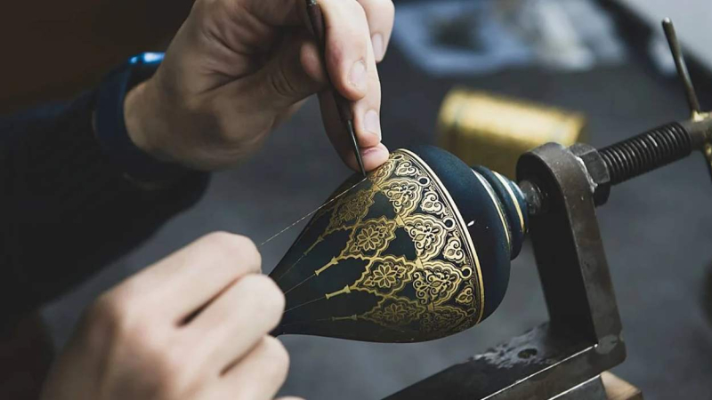 El damasquinado es una técnica artesanal de origen milenario que consiste en la incrustación de hilos o láminas de metales nobles, principalmente oro y plata, sobre una base de hierro o acero, previamente trabajada. El proceso requiere grabar la superficie metálica con finísimas incisiones para que los metales preciosos queden fijados sin necesidad de soldadura. Posteriormente, la pieza se pavona para oscurecer el fondo y resaltar el brillo del oro y la plata, dando lugar a motivos decorativos de gran detalle, inspirados tradicionalmente en la herencia islámica, vegetal o geométrica.