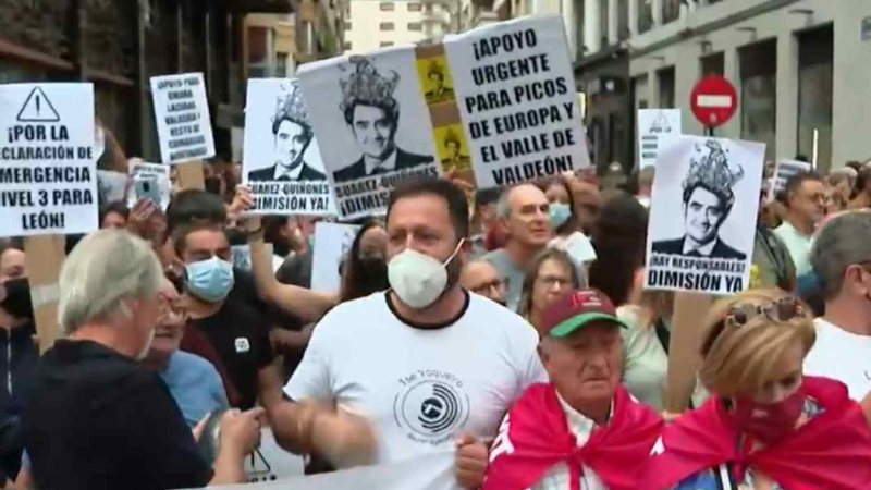 León capital ha acogido este lunes desde las 20:00 horas una concentración para exigir la dimisión de Alfonso Fernández Mañueco, presidente de la Junta de Castilla y León, y de Juan Carlos Suárez-Quiñones, consejero de Medio Ambiente, Vivienda y Ordenación del Territorio, ante la falta de prevención y medios para abordar la oleada de incendios que azota a la comunidad, especialmente a León, pero también a otras provincias como Zamora, Palencia o Ávila.
