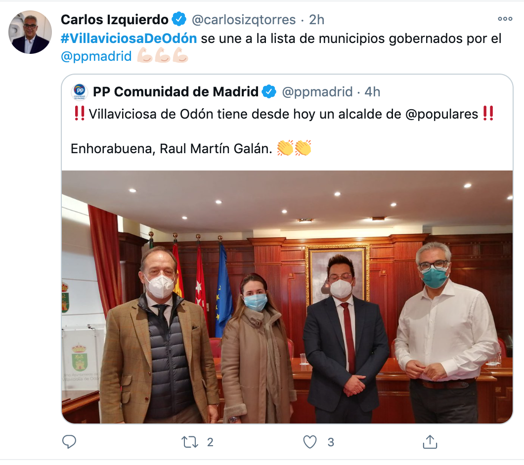 Por contra, el Partido Popular de Madrid se ha mostrado encantado de lo sucedido en sus redes sociales. Carlos Izquierdo, vicesecretario de Organización del partido de Ayuso, ha hecho lo propio e incluso ha acudido al pleno de Villaviciosa de Odón para celebrar la moción de censura.