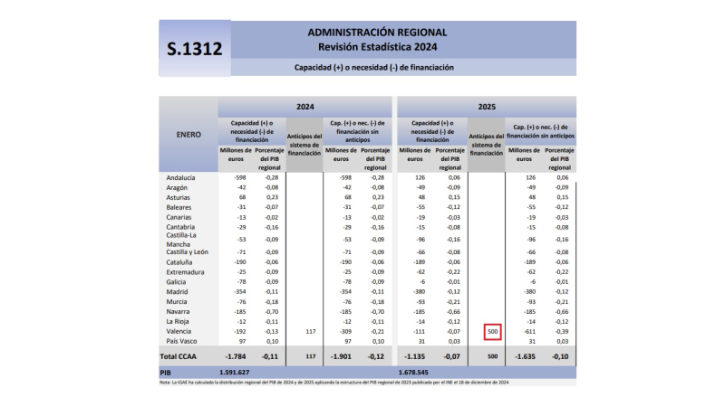 Por otra parte, este informe también revela que, de no haber contado con este anticipo, el Consell de Mazón habría registrado en enero el mayor déficit de las 17 comunidades autónomas, de 611 millones en solo 30 días de año en curso, lo que equivale al 0,39% del PIB valenciano y cuadruplicando la media de España (-0,10%). Esta cantidad duplica la que se registró en enero de 2024, de 309 millones.