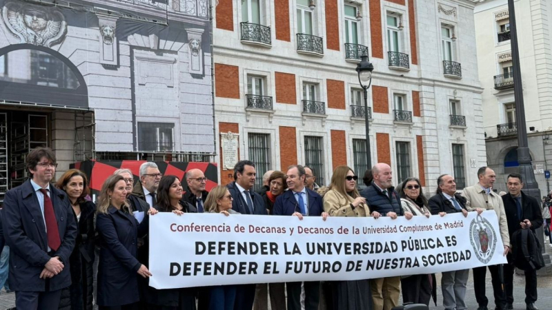 El sector universitario público sigue en pie contra la infrafinanciación y la futura ley autonómica del Gobierno madrileño de Isabel Díaz Ayuso. Prueba de ello, la manifestación esta mañana del viernes a las puertas de la Real Casa de Correos en la Puerta del Sol de los 26 decanos de la Universidad Complutense de Madrid (UCM), donde han exigido un “plan realista de financiación” y han cargado contra la forma y el contenido de la futura Ley de Enseñanzas Superiores, Universidades y Ciencia (LESUC).