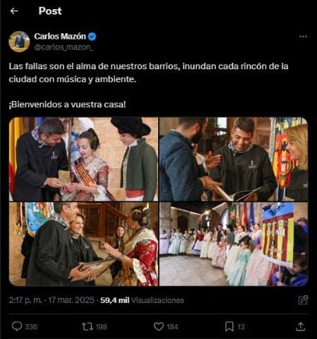 “Las Fallas son el alma de nuestros barrios, inundan cada rincón de la ciudad con música y ambiente. ¡Bienvenidos a vuestra casa!”, ha celebrado Mazón a través de X -antigua Twitter-. Un mensaje que tan sólo ha tenido unas horas de vida en la red social, puesto que ha sido eliminado.