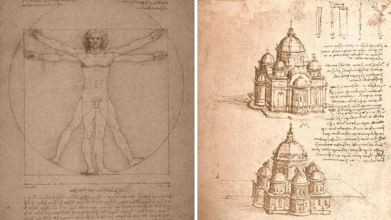 - Hombre de Vitruvio. Inspirado en la obra del arquitecto romano Vitruvio, este famoso dibujo, acompañado de notas anatómicas, es un estudio de las proporciones del cuerpo humano. Constituye una demostración gráfica de la perfección arquitectónica y geométrica del cuerpo humano, que puede encajar en un círculo y en un cuadrado.