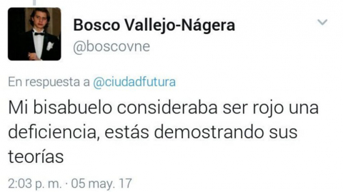 Las redes sociales son un pozo sin fondo de contenido y opiniones, a veces de lo más radicales y que incluso llegan a ser perseguidas judicialmente. No sabemos si éste será un caso en el que la Fiscalía actúe de oficio, pero lo cierto es que el mensaje en Twitter que el pasado día cinco de mayo escribió el usuario Bosco Vallejo-Nágera: “Mi abuelo consideraba ser rojo una deficiencia, estás demostrando sus teorías”.