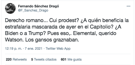 Una hora después, el escritor se ha apuntado a la teoría de la conspiración que asegura que lo sucedido en Washington es una especie de ataque de falsa bandera: "¿A quién beneficia la estrafalaria mascarada de ayer en el Capitolio? ¿A Biden o a Trump? Pues eso,. Elemental, querido Watson".