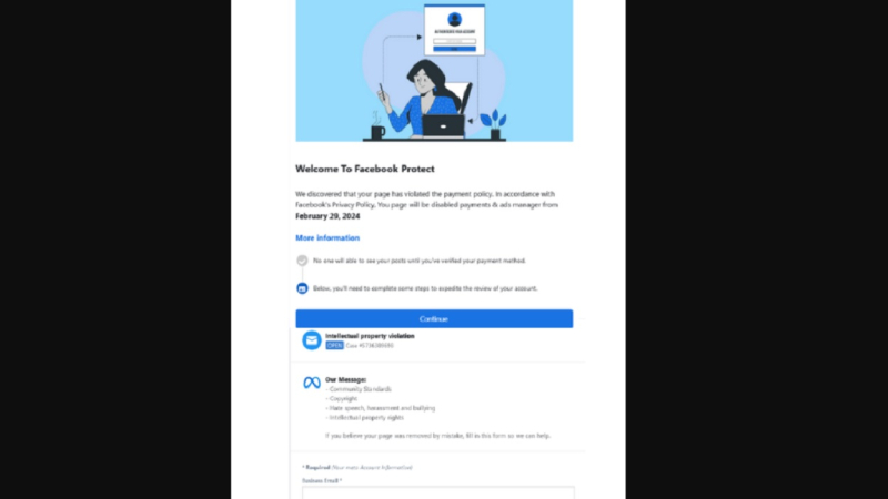 "Descubrimos que su página ha violado la política de pago. De acuerdo con la Política de Privacidad de Facebook, usted será desactivado del gestor de pagos y anuncios del 29 de febrero de 2024", indican. Tras esto, te redirigen directamente a un formulario donde piden que rellenes con los datos personales para ejecutar la supuesta penalización.