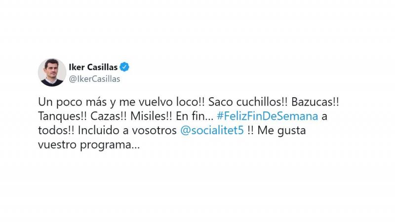 Ante las acusaciones de Socialité, las reacciones no se han hecho esperar, tampoco por parte del propio jugador. En su cuenta oficial de Twitter, Casillas ha contestado con ironía: “Un poco más y me vuelvo loco!! Saco cuchillos!! Bazucas!! Tanques!! Cazas!! Misiles!! En fin…”. Además, les ha lanzado un dardo con sarcasmo: “Me gusta vuestro programa...”, ha asegurado.