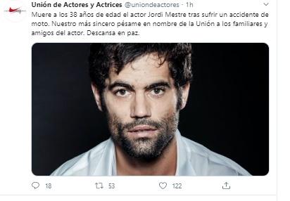 El actor Jordi Mestre ha fallecido en un accidente de moto este sábado. Así lo ha confirmado a través de Twitter la 'Unión de actores y actrices', que ha expresado su "más sincero pésame" por la muerte del también modelo español.
