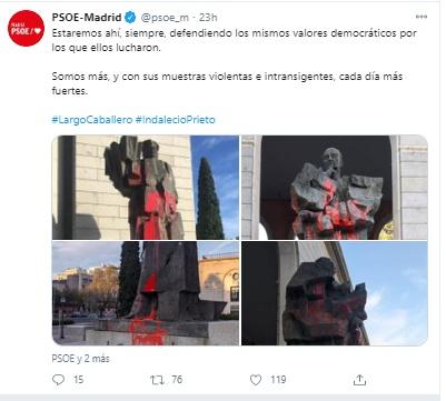 Este tercer ataque se produce más de un mes después de que el Ayuntamiento de Madrid, con los votos a favor de Cs, PP y Vox, decidiera retirar los nombres de la avenida Francisco Largo Caballero y del bulevar Indalecio Prieto, así como la placa en la plaza de Chamberí dedicado al primero, además de instar a la eliminación de las estatuas erigidas en Nuevos Ministerios en su memoria.