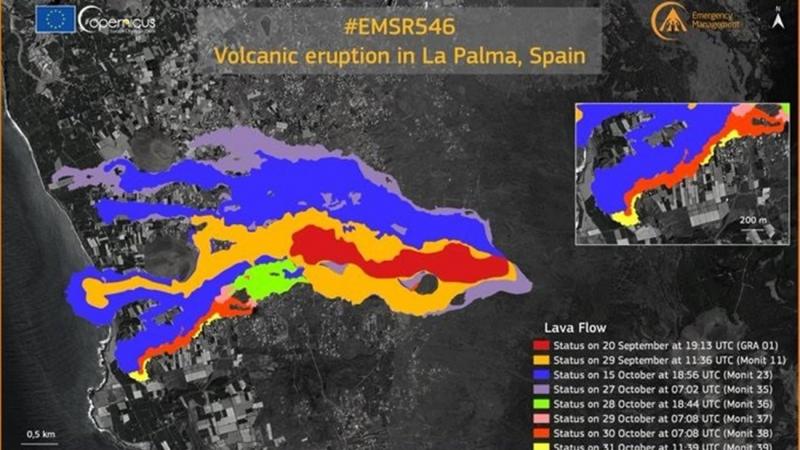 Desde que comenzó la erupción la lava ha cubierto un total de 975,2 hectáreas y ha arrasado 2.574 edificaciones, según el último informe del satélite Copernicus, programa dependiente de la Unión Europea.