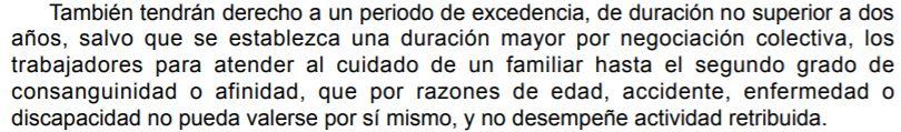 “Los trabajadores/as tendrán derecho a un periodo de excedencia, de duración no superior a dos años, para cuidar de un familiar, hasta el segundo grado de consanguinidad o afinidad, que por razones de edad, accidente, enfermedad o discapacidad, no pueda valerse por sí mismo y no desempeñe actividad retribuida”.