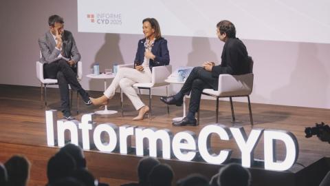 La conversación entre Ana Botín y Mariano Sigman, moderada por el periodista y escritor Rubén Amón, clausuró la presentación del Informe CYD. El acto también contó con la participación de Xavier Prats, asesor de la Fundación CYD y exdirector general de Educación y Cultura de la Comisión Europea; Pablo Claver, director general de Russell Reynolds España y patrono de la Fundación CYD; Montserrat Gomendio, rectora de la Universidad Nebrija; Federico Linares, presidente de EY España y patrono de la Fundación CYD; Sònia Martínez Vivas, directora de la Fundación CYD; y Amaya Mendikoetxea, rectora de la Universidad Autónoma de Madrid.