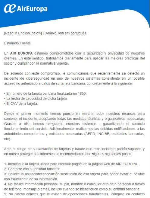 Entidades financieras como CaixaBank, Banco Santander o Banco Sabadell activaron este protocolo en cuanto se enteraron -Air Europa informó del problema de ciberseguridad a sus clientes a través de un correo electrónico de madrugada pero asegura que también se puso en contacto con las entidades financieras, sin conocer el timing exacto de las comunicaciones-, antes incluso de recibir llamadas o mensajes de sus clientes preocupados por el correo recibido en la madrugada del martes.