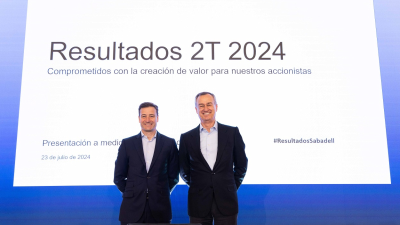 El consejero delegado de Banco Sabadell, César González-Bueno, y el director financiero del banco, Leopoldo Alvear, han sido los encargados de presentar las cuentas semestrales de la entidad, esta vez en su sede catalana de Sant Cugat del Vallés. El banco ha cerrado la primera mitad del año con un beneficio récord de 791 millones de euros, un 40,3% más frente al mismo periodo del año anterior, y prevé cerrar el ejercicio anual con otro récord de beneficio, manteniendo la racha alcista y positiva registrada hasta ahora.