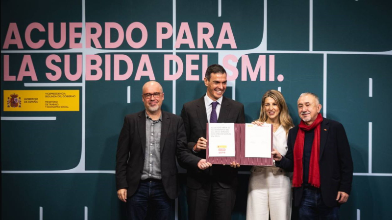 La nueva subida del Salario Mínimo Interprofesional (SMI) ha sido rubricada por los sindicatos mayoritarios y el Ministerio de Trabajo. El secretario general de CCOO, Unai Sordo, y el secretario general de UGT, Pepe Álvarez, por un lado; y la vicepresidenta segunda del Gobierno, Yolanda Díaz, han plasmado sus firmas sobre la elevación del 3,1%, que se lleva la cuantía mínima hasta los 17.094 euros anuales brutos y 1.221 euros mensuales brutos en 14 pagas (1.424,59 euros en 12 pagas). Las patronales han rechazado formar parte del acuerdo al considerar excesivo el incremento.