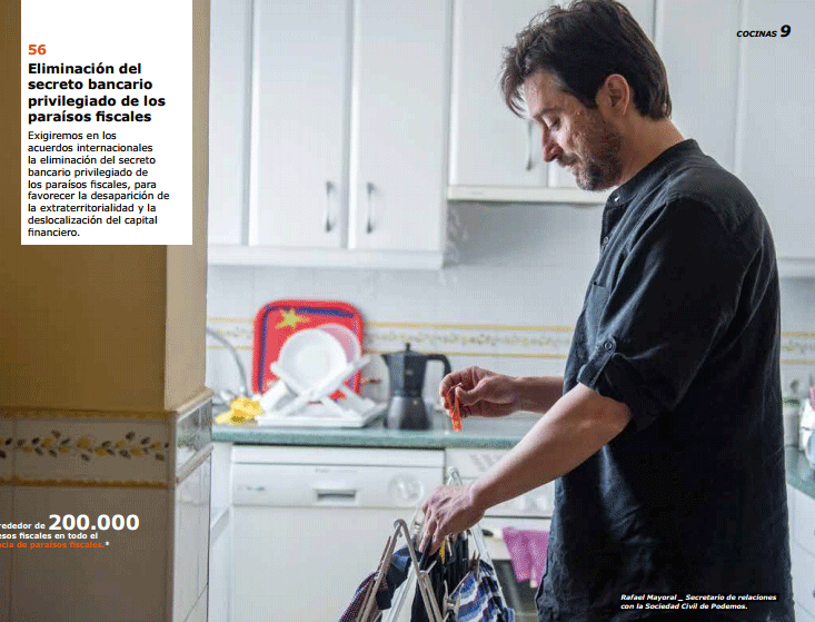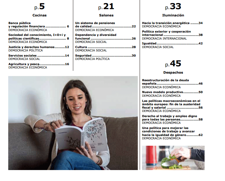 En él, los dirigentes de Podemos aparecen regando las plantas, fregando los platos, leyendo poesía o en bata desayunando mientras a su alrededor se despliega el texto con el que prenden cambiar la política española.