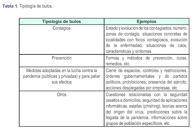 Tipología de bulos: contagios, estado y evolución de la pandemia; formas de prevención y curas; medidas (públicas y privadas) adoptadas en la lucha contra la pandemia y para paliar sus efectos y otros.