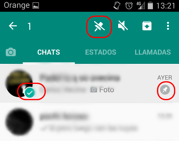 Como siempre que hablamos de WhatsApp, la manera de fijar los chats es tan simple como mantener pulsado el que quieras resaltar durante un par de segundos y, una vez que aparece seleccionado, en la parte superior lo anclas con el símbolo de la chincheta.