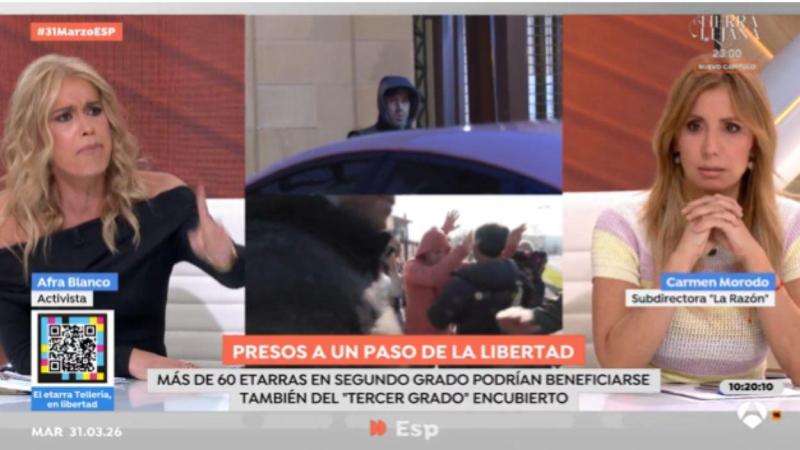 La salida de prisión de Soledad Iparraguirre 'Anboto', la que fuera jefa de ETA imputada por más de 12 asesinatos, y la posibilidad de que 60 etarras puedan beneficiarse de un tercer grado ha vuelto a generar un tenso debate en la sociedad, pero también en los platós de televisión. Desde Espejo Público, Afra Blanco mantenía un encendido debate con otra tertuliana, que terminaba vertiendo unas insinuaciones en directo que hacían estallar a la sindicalista.