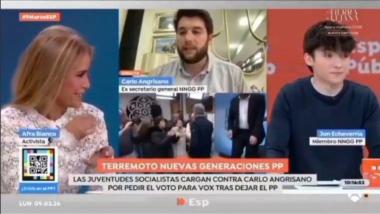 El pasado fin de semana, el secretario general de las Nuevas Generaciones del Partido Popular, Carlo Angrisano, presentaba su dimisión y solicitaba la baja del partido al asegurar que "se ha alejado de las convicciones" que le llevaron a afiliarse. Además, se despedía pidiendo abiertamente el voto para Vox "para defender las ideas en las que cree desde una posición en la que no hay que pedir perdón". Angirsano intervenía en Espejo Público, donde se encontraba el actual Vicesecretario de Organización de Nuevas Generaciones del PP de Guipúzcoa, Jon Echeverría. Ambos terminaban protagonizando un enfrentamiento, al que Afra Blanco asistía con sus "palomitas".