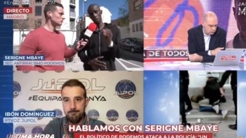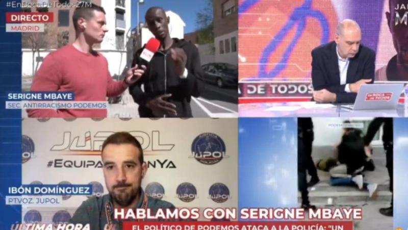 Abad daba el turno de palabra a Ibón Domínguez, portavoz de Jupol, que trataba de tirar por tierra el relato de Mbaye, haciendo recaer la culpa sobre su tejado: "La verdad que me hace bastante gracia, no veía a una persona victimizarse tanto desde Rubiales. Lo que cuenta no es cierto y lo sabe". Según Domínguez, el reconocido activista antirracista "hizo caso omiso a las indicaciones" y "huyó de una intervención policial". Además, lo ha acusado de "golpear a uno de mis compañeros".