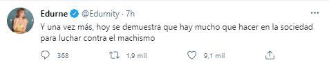 Las bromas hacia Edurne y David De Gea no dejaron de sucederse hasta que la artista dijo basta. “Una vez más, hoy se demuestra que hay mucho que hacer en la sociedad para luchar contra el machismo”, publicó la cantante, que se ganó un apoyo casi total de la comunidad tuitera.