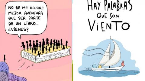 Este año celebramos un Día del Libro diferente y virtual, pero no menos emotivo. La gran fiesta de la literatura se traslada a las redes sociales y, entre las iniciativas más conmovedoras está 'Hay palabras que son viento', un libro digital de la Fundación "la Caixa" ilustrado por el catalán Dalmaus (el dibujante catalán que ve siempre el lado positivo de las cosas) y 72kilos (dibujante bilbaíno especializado en captar sentimientos) en el que recoge las frases de aliento en esta batalla contra el coronavirus enviadas a la cuenta de Instagram de la Fundación. Son en total 23 frases de ánimo que dibujan una sociedad solidaria, unida y fuerte frente a un enemigo invisible.