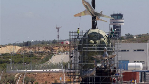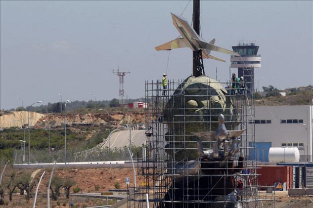 Ayer 'aterrizó' en el aeropuerto de Castellón el primer avión: una pieza de acero inoxidable que culmina la estatua del artista Juan Ripollés que está inspirada, aunque él lo niegue, en Carlos Fabra. La obra ha costado 300.000 euros y los socialistas denuncian que se adjudicó a dedo sin concurso público. Foto: EFE