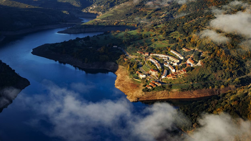 El mejor lugar para observar el antiguo pueblo es el mirador junto a la Ermita de Santa Catalina, un templo románico del siglo XII que permanece en pie frente al embalse. Es el vestigio más importante que sobrevivió a la inundación. Desde allí, el paisaje combina naturaleza y memoria: agua, montaña y ruinas.