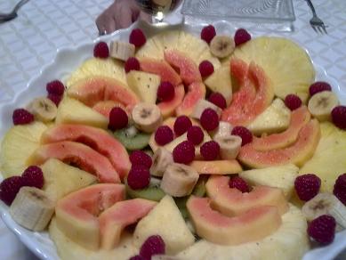 Cortamos las frutas en láminas finas y preparamos unos hojaldres con ellas interponiendo el queso también partido en rodajas finas. Lo mejor es hacerlo en cada plato. Rociamos con un poco de limón y ponemos un poco de mermelada de tomate, decorando.
