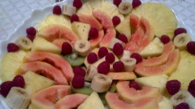 Dos mangos, un aguacate, una papaya, dos melocotones, trescientos gramos de queso fresco de cabra u oveja, un limón y mermelada de tomate.