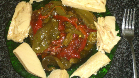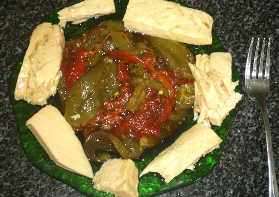 Ensalada de pimientos asados con troncos de atún.