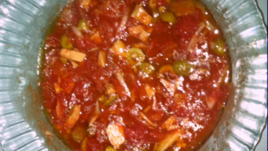 En Murcia a esta ensalada también le llaman “moje”. Abrimos el bote de tomate y vertemos su contenido en una fuente de ensalada honda dejamos que se airee durante media hora. En un plato sacamos el atún escurrido de las latas y lo mezclamos con las cebolletas picadas en tiras gruesas y las aceitunas al gusto. Lo ponemos todo sobre el tomate que habremos machacado para que queden en hebras finas, salamos, rociamos con unas gotas de limón y aceite de oliva. Removemos y servimos.