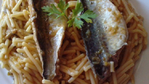 Esta es una receta que me envían Lola y Paco, desde Dos Hermanas en Sevilla y dicen que la receta es gaditana. Limpiar las caballas y secar con cuidado los lomos quitando las espinas y reservar. Con las cabezas y espinas se hace el caldo para los fideos. Pelar y picar las cebollas en juliana y filetear los ajos y sofreír en una cazuela baja con aceite de oliva, añadir el pimiento verde cortado en dados pequeños, agregar el tomate pelado y cortado en dados y sin pepitas y estofar a fuego lento. Cuando las verduras estén en su punto, añadir los fideos y rehogar unos tres minutos sin dejar de remover para que no se peguen, verter el caldo de pescado, sazonar y dejar a fuego medio removiendo de vez en cuando con una cuchara de madera. A los diez minutos, añadir los lomos de caballa enteros, rectificar de sal si es necesario y terminar de cocer. Servimos caliente y controlando el caldo al gusto -reducir el caldo con fuego vivo, si lo queremos más seco-.