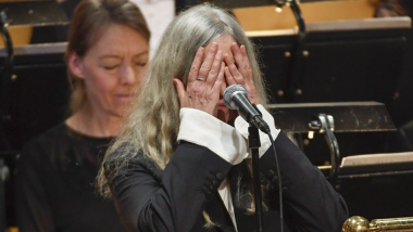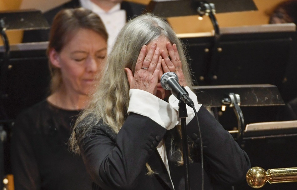 La cantautora estadounidense Patti Smith se convirtió hoy muy a su pesar en protagonista de la ceremonia de entrega de los Premios Nobel, aunque no recibía ningún galardón, y con su voz eclipsó la ausencia del laureado en Literatura, Bob Dylan, de quien interpretó el tema "A Hard Rain's A-Gonna Fall".