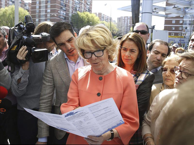 La presidenta del PP de Madrid y candidata popular a la Alcaldía de la capital, Esperanza Aguirre, durante su visita hoy al punto de encuentro con los ciudadanos que el partido ha instalado junto al centro comercial La Vaguada. EFE