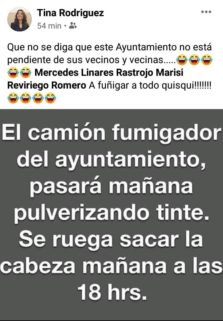 Pese a que la cuenta de Facebook de la alcaldesa cuenta con numerosas publicaciones en las que informa a los vecinos de la localidad de las acciones que se llevan acabo desde el consistorio, destacan algunas publicaciones que Rodríguez ha hecho durante el confinamiento. En una de ellas, y en pleno confinamiento, la alcaldesa publicaba en la red social que "el camión fumigador del ayuntamiento, pasará mañana pulverizando tinte. Se ruega sacar la cabeza mañana a las 18 hrs", a la vez que comentaba que "a 'fuñigar' a todo quisqui".