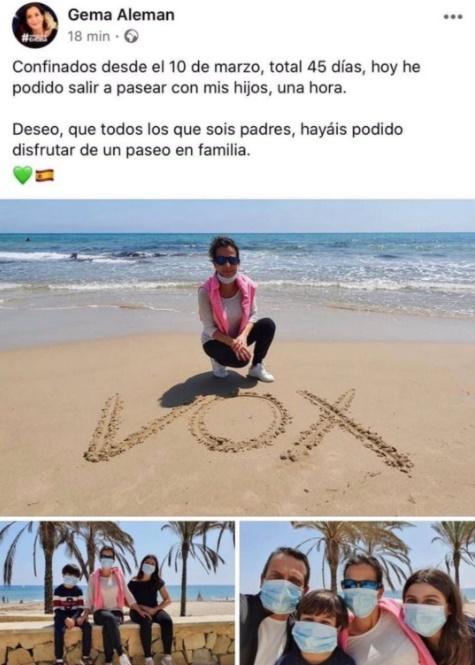 Entre quienes parecen haberse saltado las reglas está una concejala de Vox. Gema Aleman, edil de la formación ultra en el municipio de Sant Joan d`Alacant, ha publicado unas fotografías de cómo ha sido esta pimera jornada de desconfinamiento para su familia. En las imágenes Aleman posa con sus dos hijos, pero también con su marido. La norma establece que los niños salga únicamente con uno de los progenitores, algo que se han encargado de recordarle los internautas.
