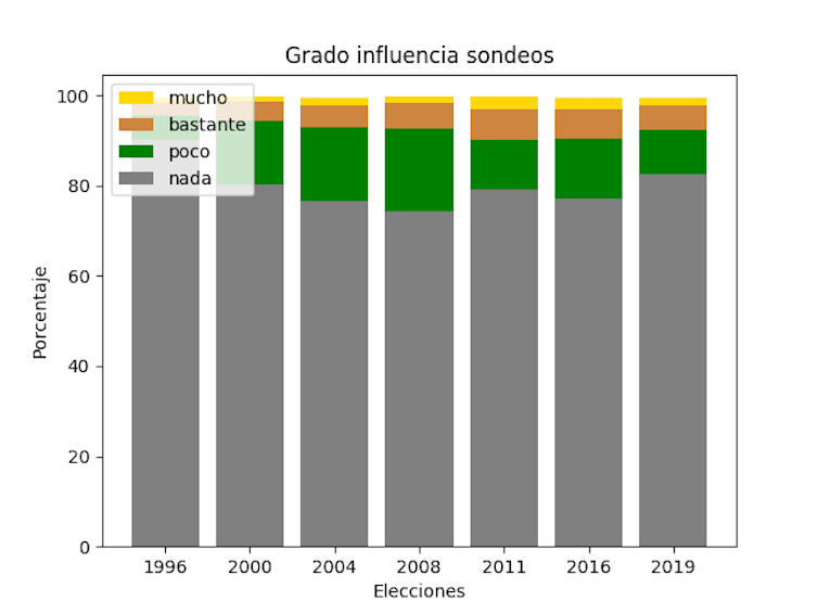 En la era digital parece que la prohibición de que se publiquen sondeos cinco días antes de los comicios ya no tiene sentido. Asimismo, y como muestra la Figura 1, que presenta la evolución del grado de influencia de los sondeos en la decisión de voto, estos no parecen tener un papel principal en la opción de los electores. Las barras grises (ninguna influencia) y verdes (poca influencia) son las predominantes en todas las elecciones analizadas (los niveles más altos de mucha o bastante influencia se registraron en los comicios de 2011, un 9,5 por ciento).