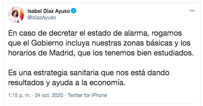 "En caso de decretar el estado de alarma, rogamos que el Gobierno incluya nuestras zonas básicas y los horarios de Madrid, que los tenemos bien estudiados", ha afirmado la presidenta a través de su cuenta de Twitter.