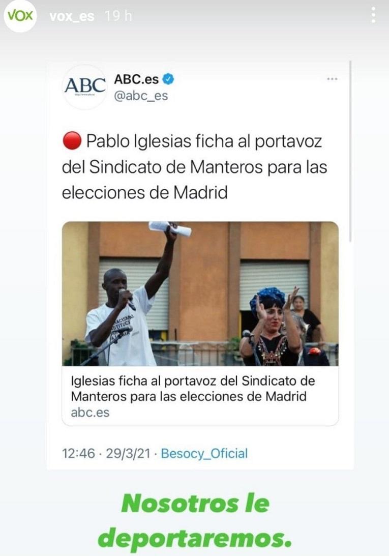 Fue el pasado 30 de marzo cuando Vox amenazaba con deportar a Mbayé a través de su cuenta de Instagram, después de oficializarse el fichaje de este para la candidatura de Unidas Podemos de cara a las elecciones de la Comunidad de Madrid del próximo 4 de mayo.