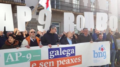 Este sábado militantes del Bloque han protagonizado una protesta en A Coruña ante la Delegación del Gobierno tras una pancarta en la que se podía leer 'AP-9 galega e sen peaxes', mientras varias personas portaban letras que conformaba la palabra 'roubo'. Todo ello, después de que el viernes el Gobierno diese luz verde a una nueva subida del 2,69% en los peajes a partir del 1 de enero.