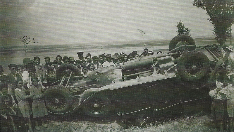 La hemeroteca nos descubre otro dato no menor, como es que el automóvil circulaba a una velocidad excesiva. Curva cerrada, cambio de rasante y una alta velocidad, fueron los ingredientes de una conducción cuando menos osada e imprudente. Tras llegar a esa curva, fue lógico que arrollase a los dos ciclistas que circulaban en paralelo. Por causa del choque, el vehículo sufrió el reventón de la rueda delantera izquierda, después se salió de la calzada por la izquierda y dio dos vueltas de campana. Finalmente, el Hispano Suiza blindado quedó volcado en la cuneta con las ruedas hacia arriba.