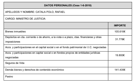 Un patrimonio que se vio muy menguado si se observa su primera declaración patrimonial como ministro de Justicia (cuyo cese se produjo el 3 de noviembre 2016). Entonces, Catalá afirmó contar con tan solo 105.610,46 euros relativos a bienes patrimoniales. Sus depósitos en cuenta corriente o de ahorro alcanzaban los 7.140,23 euros y las acciones y participaciones sumaban 38.152,08 euros. Además, decía contar con 66.143 euros en seguros de vida y 145.170,49 euros relativos a otros bienes.