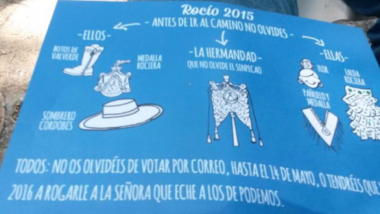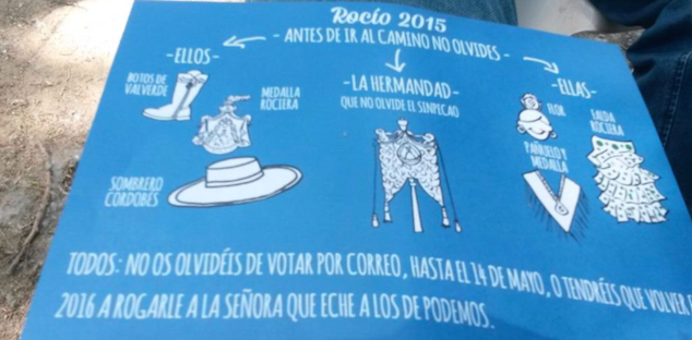 En el folleto, el PP también ofrecía otra serie de consejos a los romeros (llevar botos de Valverde, sombrero cordobés y no olvidar ponerse la medalla rociera), a las romeras (llevar una flor, el pañuelo y la medalla y la falda rociera) y a la Hermandad del Rocío –“no olvidar el sinpecao” (sic)-. Aún así, el mensaje más nítido era el que pedía a los feligreses que hicieran uso del voto por correo.