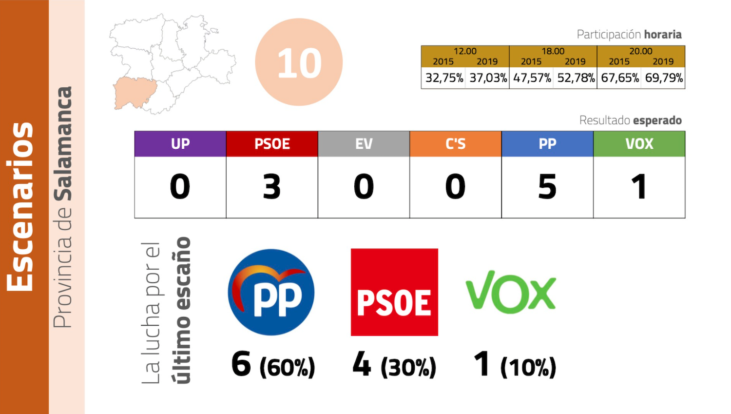 Por otro lado, los expertos destacan que la participación será fundamental: “Una bajada al 60% a las 20 horas o al 30% a las 14 horas generarán una indecisión sobre el voto final y aumentará las posibilidades de las formaciones territoriales y de izquierdas”.